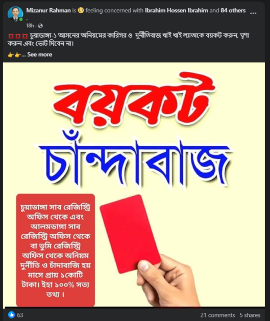 চুয়াডাঙ্গা ও আলমডাঙ্গা সাব-রেজিস্ট্রি অফিসে মাসপ্রতি প্রায় এক কোটি টাকার অনিয়ম, দুর্নীতি ও চাঁদাবাজির অভিযোগ তুলে সামাজিক যোগাযোগ মাধ্যমে শোরগোল ফেলেছেন বিএনপি নেতা ও ক্রীড়া সংগঠক মিজানুর রহমান মধু। এলাকায় সমাজসেবক হিসেবে পরিচিত এই নেতার বিস্ফোরক ফেসবুক পোস্টটি এখন জেলাজুড়ে আলোচনার কেন্দ্রবিন্দুতে পরিণত হয়েছে। রাজনৈতিক ও সামাজিক নানা বিষয়ে বিতর্কিত এবং সাহসী পোস্টের জন্য পরিচিত মধু এবার সরাসরি সরকারি দপ্তরের আর্থিক অনিয়মের দিকে আঙুল তুললেন।