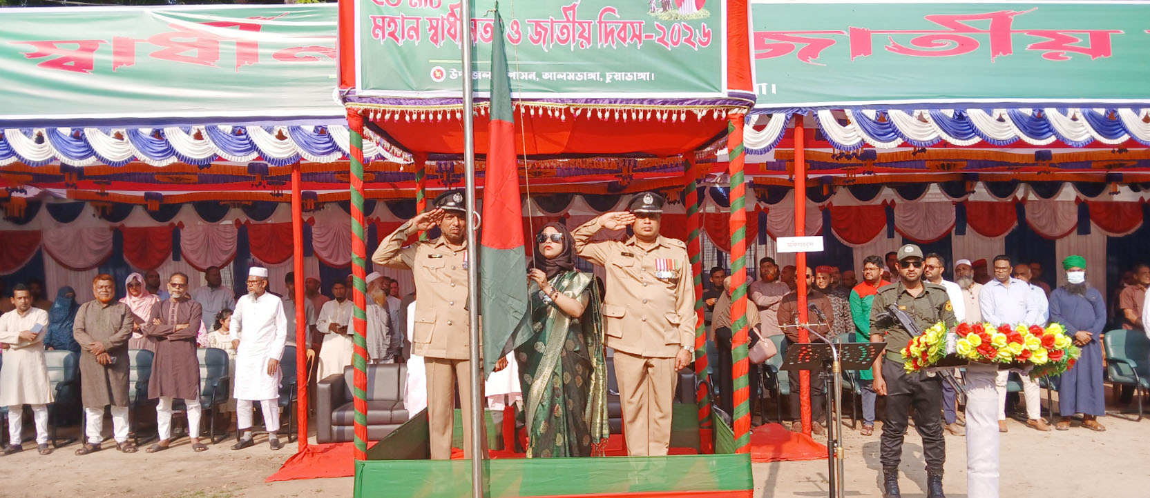 উপজেলা নির্বাহী অফিসার পান্না আক্তার, চুয়াডাঙ্গা ১ আসনের সংসদ সদস্য অ্যাড. মাসুদ পারভেজ রাসেল, আলমডাঙ্গা থানার অফিসার বানী ঈসরাঈলের নেতৃত্বে শহীদ মাজারে পুষ্পমাল্য অর্পণ করা হয়। এরপর সকাল ৮ টায় আনুষ্ঠানিকভাবে জাতীয় সংগীতের তালে তালে জাতীয় পতাকা উত্তোলন করেন উপজেলা নির্বাহী অফিসার পান্না আক্তার ও আলমডাঙ্গা থানা অফিসার ইনচার্জ বানী ইসরাঈল।
